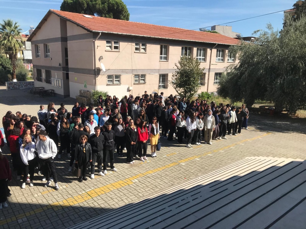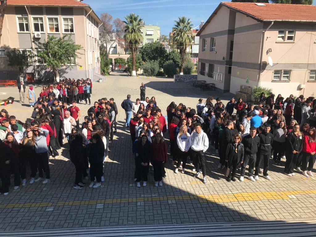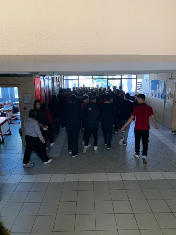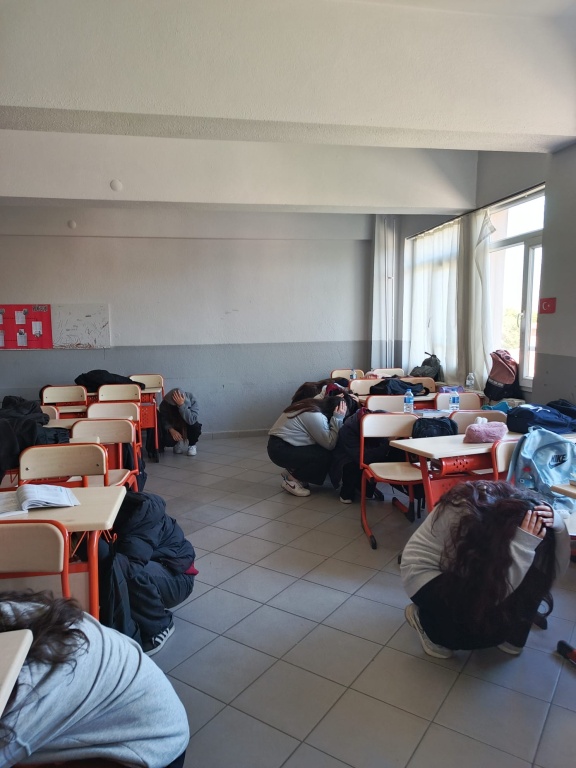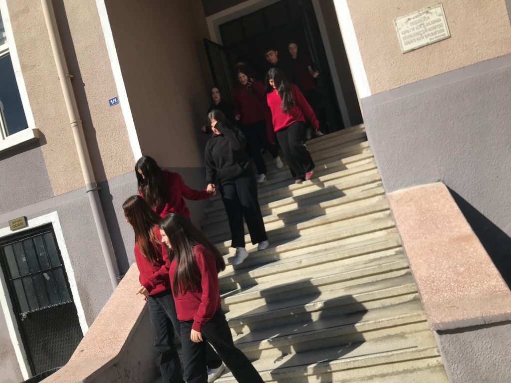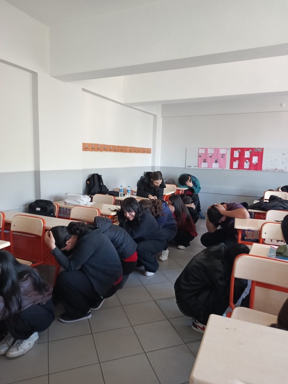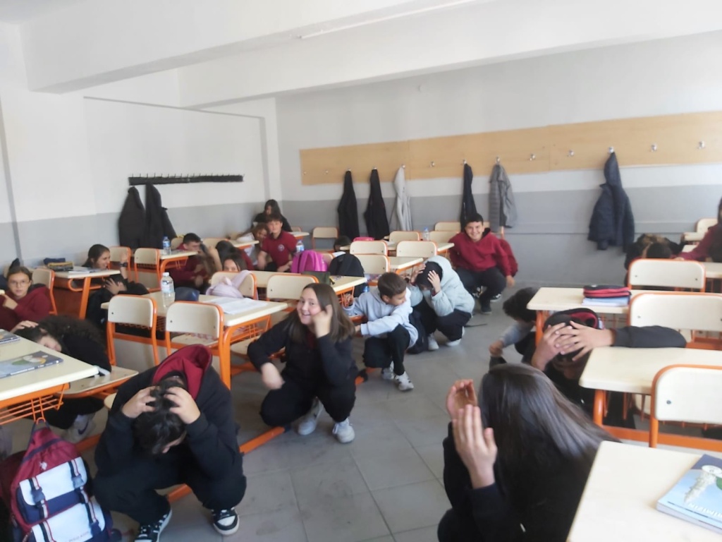 Deprem tatbikatında 'Çök, kapan, tutun' şeklinde deprem sırasında bulunulması gereken durum ve yapılması gerekenler anlatıldı. Öğrenciler ise eğitmenlerden 'Çök kapan tutun' pozisyonunu uygulamalı olarak öğrendi. Senaryo gereği deprem sırasında sirenler çalarken, sınıflardaki öğrenciler öğretmenleri eşliğinde merdivenlerden inerek okul bahçesinde toplandı. Deprem riski geçinceye kadar öğrenciler öğretmenleriyle bahçede beklemeye devam etti.